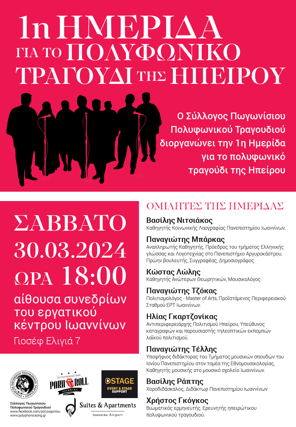 Ο Σύλλογος Πωγωνίσιου Πολυφωνικού Τραγουδιού διοργανώνει την 1η Ημερίδα για το Πολυφωνικό Τραγούδι της Ηπείρου, το Σάββατο 30 Μαρτίου 2024 και ώρα 18:00, στην Αίθουσα Συνεδρίων του Εργατικού Κέντρου Ιωάννινων – Γιοσέφ Ελιγιά 7.